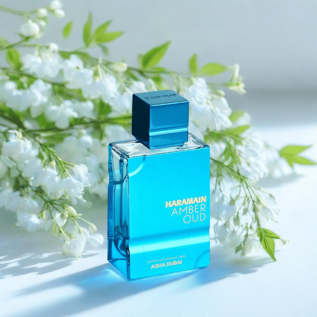 Immerse yourself in the luxurious essence of Al Haramain Amber Oud Aqua Dubai Extrait De Parfum.
