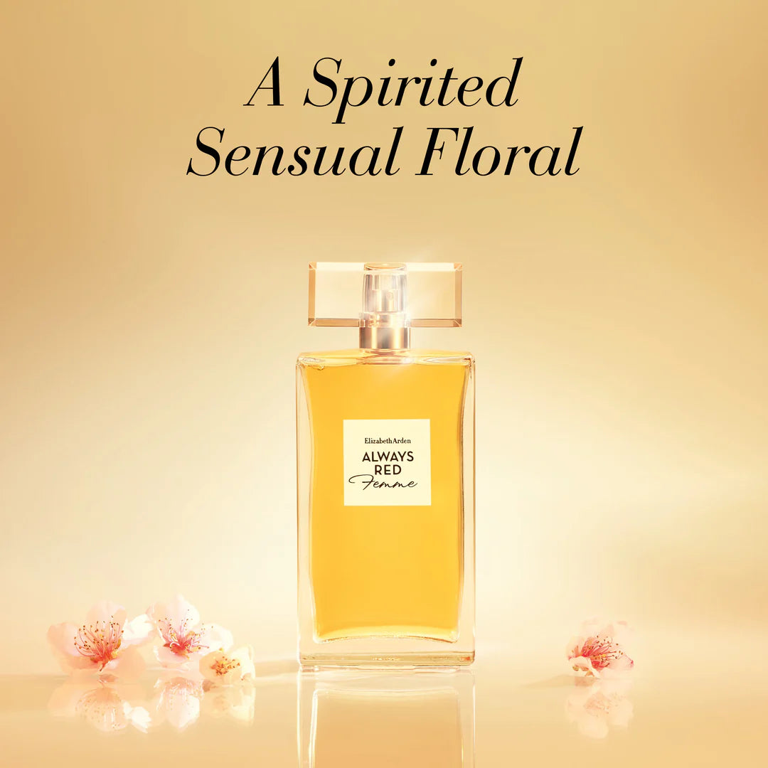 Elizabeth Arden Always Red Femme EDT: Sophisticated, vibrant fragrance with blackcurrant, lemon, jasmine, and patchouli notes.