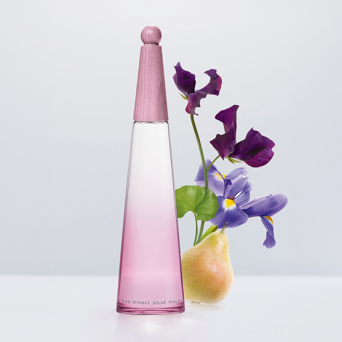 • A delicate purple bottle echoes floral elegance