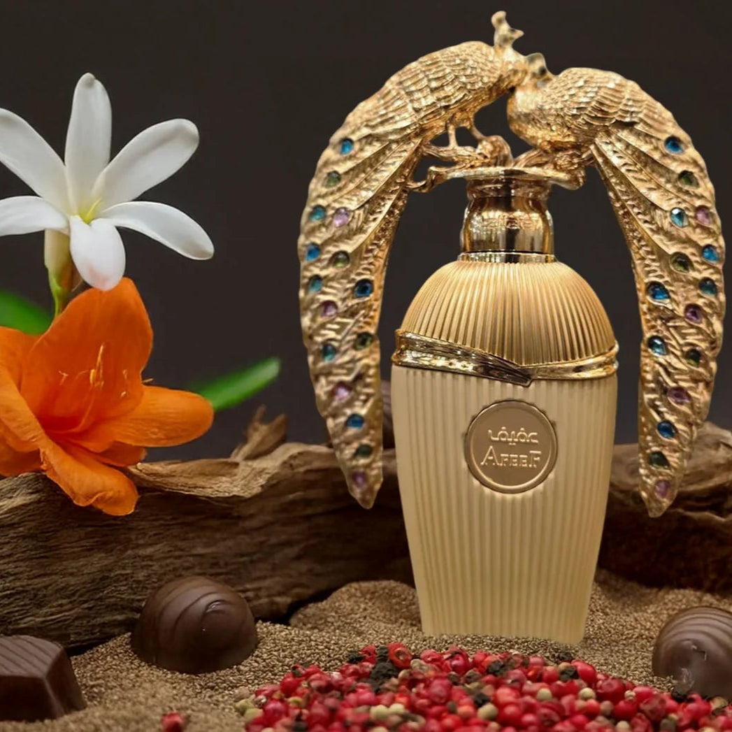 Lattafa Afeef: a unisex, long-lasting Eau de Parfum with peach, jasmine, and amber notes, offering elegance and sophistication.