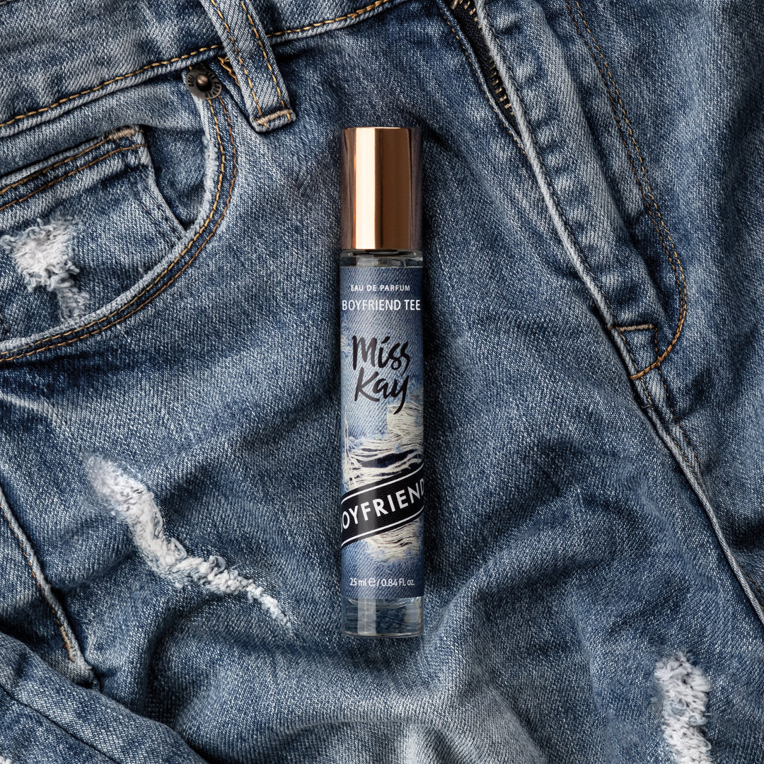 Miss Kay Boyfriend Tee EDP is a vibrant, warm fragrance blending sweet, woody, floral, and leather notes, perfect for dreamers.