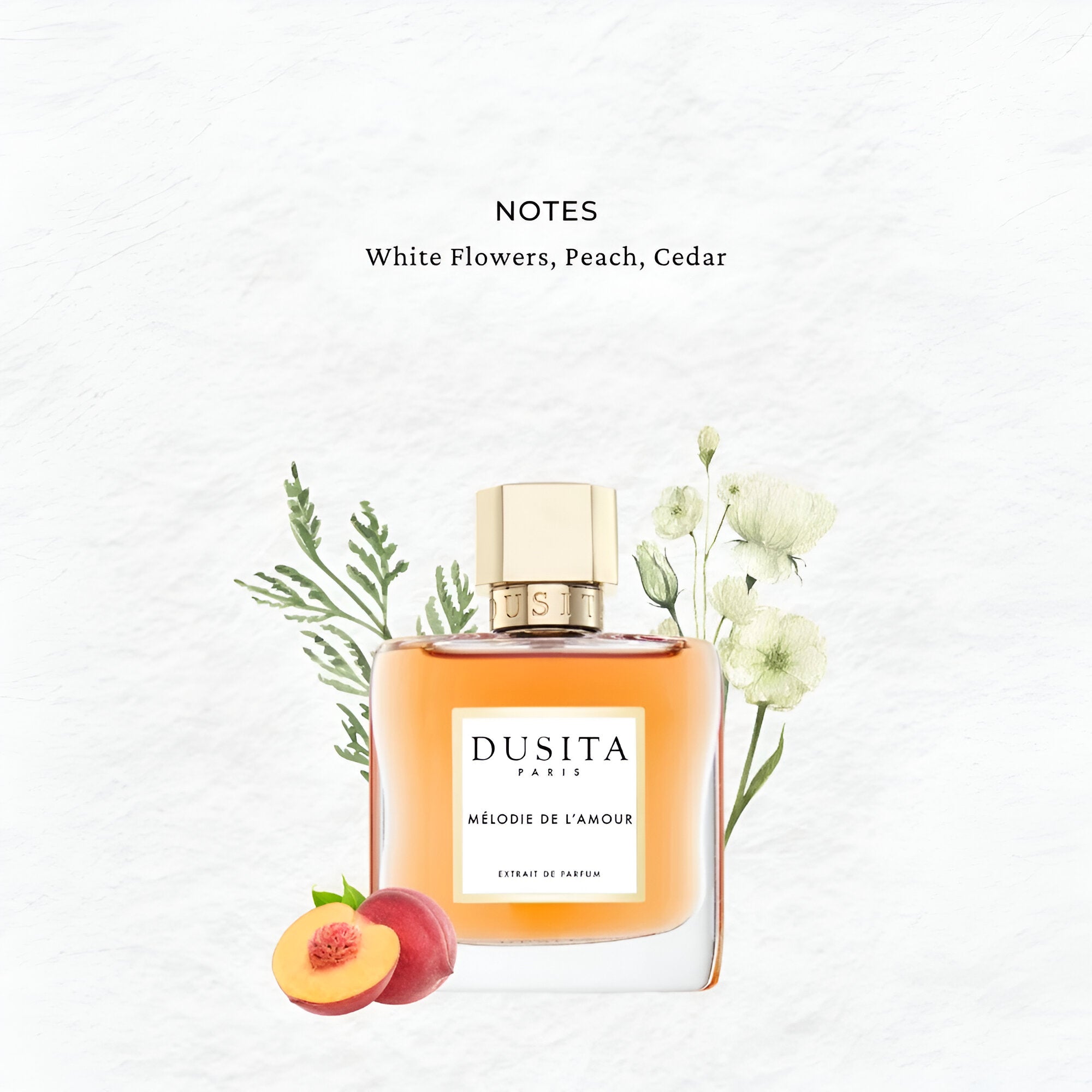 Parfums Dusita Melodie De L'Amour Extrait De Parfum smells like a delicate and enchanting bouquet of white florals with a hint of peach, creating a subtle yet captivating presence.