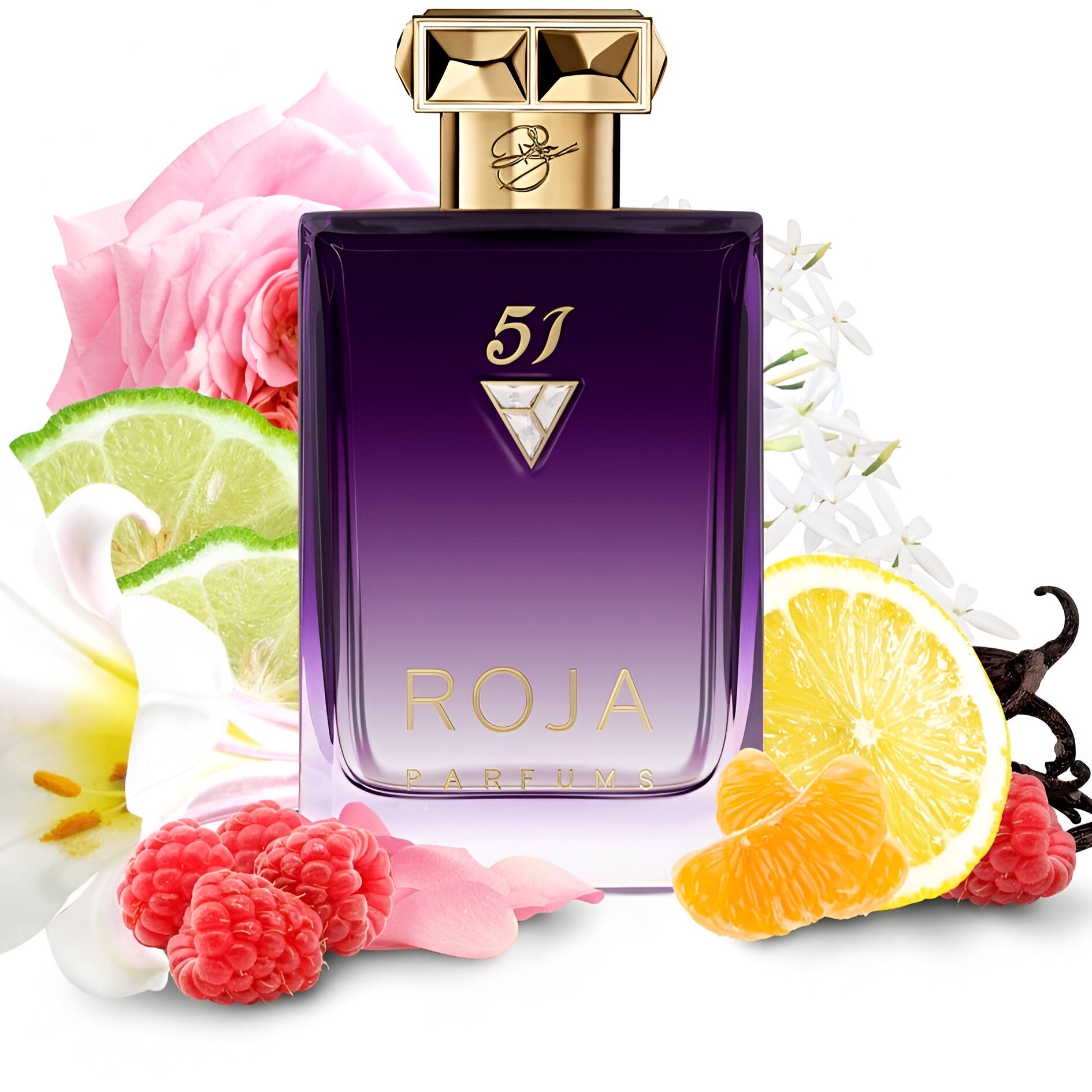 Roja Parfums 51 Pour Femme smells of jasmine, rose, with fruity, floral, and woody notes, accented by fresh bergamot and raspberry.